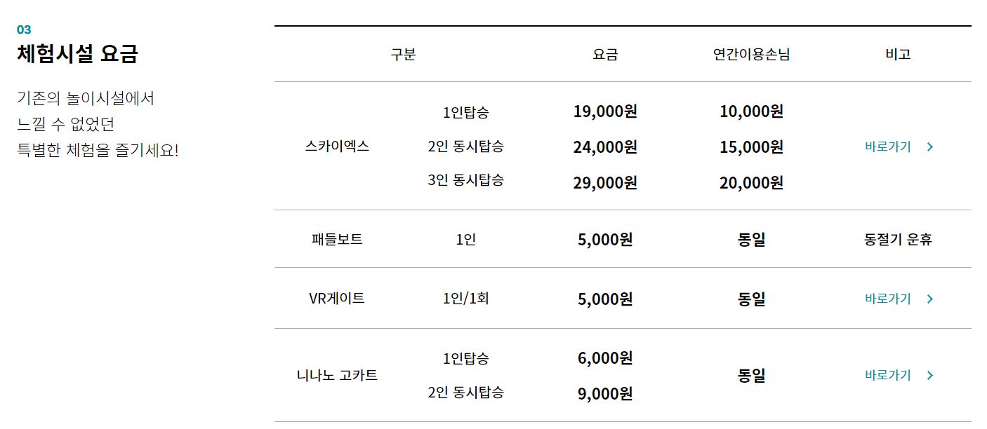 체험시설 요금은 파크이용권과 별도이며 파크이용권 소지후에 이용 가능하다.