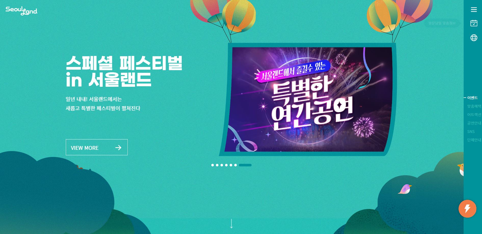 서울랜드 홈페이지는 아래와 같다. 우측에 막대 모양 3개를 터치하면 전체 메뉴 보기가 가능하다.