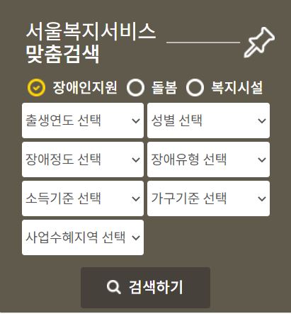 장애인지원의 경우 출생연도, 성별, 장애정도, 장애유형, 소득기준, 가구기준, 사업수혜지역을 입력하고 검색하면 조건에 맞는 복지정책을 알려줍니다.