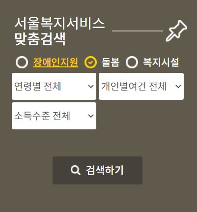 돌봄의 경우 연령별, 개인별여건, 소득수준을 선택하면 조건에 맞는 복지정책을 알려줍니다.