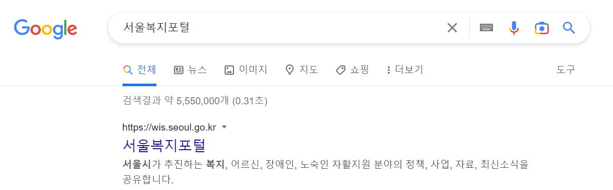 서울복지포털은 복지, 어르신, 장애인, 노숙인 자활지원 분야의 정책, 사업, 자료, 최신소식을 공유하는 플랫폼으로 관심있는분들은 방문하면 유용한 정보를 볼 수 있습니다. 구글 검색창에 '서울복지포털'을 검색하면 다음처럼 홈페이지 주소가 나옵니다.