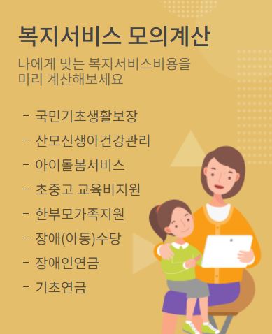 국민기초생활보장, 산모신생아건강관리, 아이돌봄서비스, 초중고교육비지원, 한부모가족지원, 장애(아동)수당, 장애인연금, 기초연금과 같이 나에게 맞는 복지서비스와 비용을 미리 계산해볼 수 있는 복지서비스 모의계산 서비스가 있습니다.