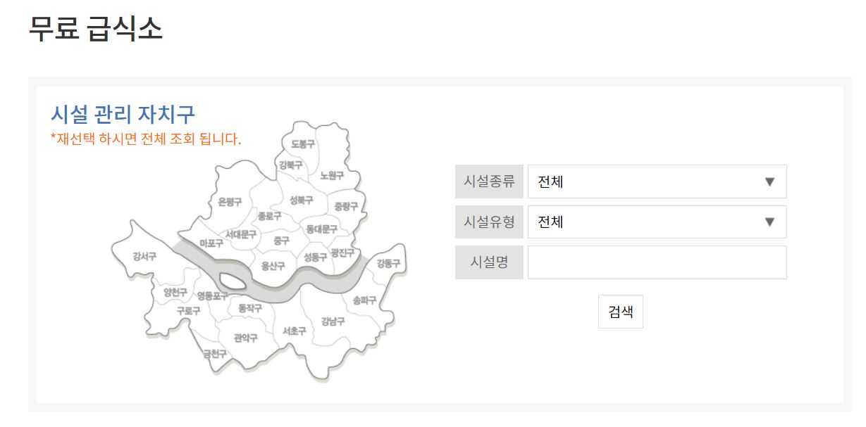 복지관, 직업재활시설, 급식시설, 노인복지관, 지역밀착 사회복지관, 노숙인이용시설, 주간보호시설 등을 찾을 수 있는 검색창과 지도도 있습니다.