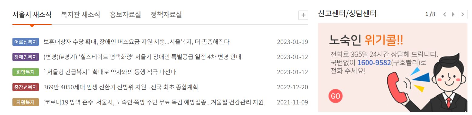서울시 새소식, 복지관 새소식은 최근 서울시나 복지관에 대한 소식을 전해주고 있으며 신고센터 및 상담센터를 운영하며 365일 24시간 이용할 수 있는 콜센터에 문의사항이 있을 경우 상담을 할 수 있습니다. 노숙인의 경우 '노숙인 위기콜 1600-9582 구호빨리'를 이용하면 됩니다.