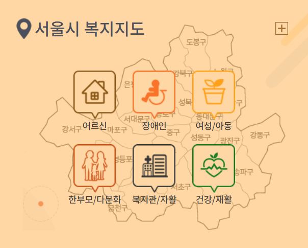 어르신, 장애인, 여성/아동, 한부모/다문화, 복지관/자활, 건강/재활 관련한 복지서비스도 한눈에 볼 수 있습니다.