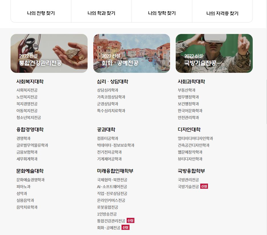서사대의 전공을 한눈에 볼 수도 있습니다. 또한 내가 받을 수 있는 장학혜택이나 내가 관심 있는 자격증과 관련한 전공을 검색할 수도 있습니다. 가능하면 장학혜택을 받으면 학비에 대한 부담도 줄고 학업에 매진할 수 있습니다.
