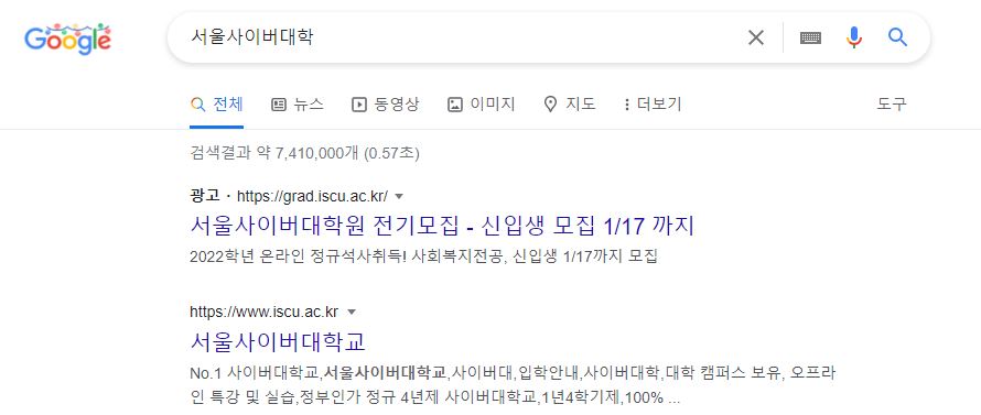 아래는 서울사이버대학(이하 서사대) 입학처 홈페이지입니다.
