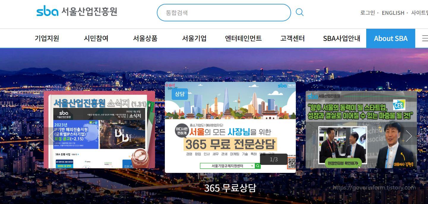 구글 검색창에 '서울산업진흥원'이라고 검색하면 서울산업진흥원 홈페이지 url(https://www.sba.seoul.kr/)이 나오는데 여기에 접근하면 서울산업진흥원 홈페이지 메인페이지(첫화면)가 나옵니다. 서울산업진흥원의 약자인 SBA소개 고객센터 서울기업 시민참여 등의 메뉴 이용이 가능합니다.