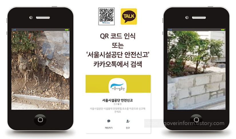 서울시설공단에서는 시민안전신고센터를 운영하고 있습니다. 신고방법은 기존 시민안전신고센터를 통해 신고를 하거나 신고절차가 쉬운 카카오톡을 통해 신고를 해도 됩니다. 신고대상시설은 청계천, 지하도상가, 월드컵경기장, 고척돔경기장, 장충체육관, 어린이대공원, 시립승화원, 추모공원, 공영주차장입니다. 시민안전신고센터 > 글쓰기 > 본인 인증 절차 > 안전신고 내용 작성 또는 QR 코드 인식 또는 '서울시설공단 안전신고' 카카오톡에서 검색 > 안전위험요소 발견(사진촬영) > 카카오톡을 통한 신고(사진첨부, 신고) > 안전위험요소 해결