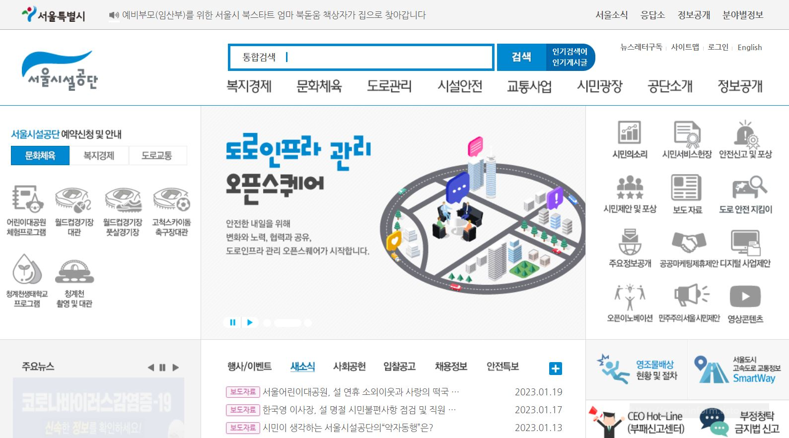 구글 검색창에 서울시설공단을 입력하고 나오는 url(https://www.sisul.or.kr/)에 접근하면 서울시설공단 홈페이지 첫화면이 나옵니다. 서울시설공단에서는 복지경제 문화체육 도로관리 시설안전 교통사업 시민광장 공단소개 정보공개가 있습니다. 서울시설공단 예약신청 및 안내(문화체육, 복지경제, 도로교통) 시민의 소리 시민서비스헌장 안전신고 및 포상 시민제안 및 포상 보도자료 도로 안전 지킴이 행사/이벤트 새 소식 사회공헌 입찰공고 채용정보 안전특보 등 서비스가 있습니다.