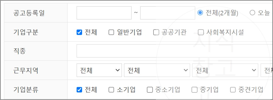 기업구분, 직종(직종검색), 근무지역, 기업분류, 우수중소기업, 학력, 경력, 급여, 우대조건 등을 선택하고