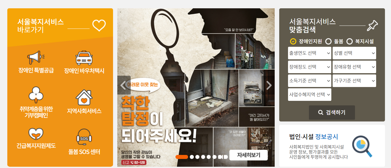 요즘 복지정책이 아주 잘되어있어 나에게 해당되는 복지가 궁금하신 분들은 서울시청 복지정보를 확인하면 좋습니다. 지역별 대상별로 잘 되어있기 때문에 쉽게 내게 맞는 복지정보를 확인할 수 있습니다.