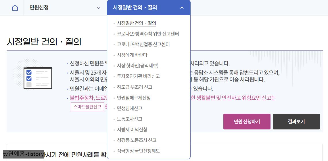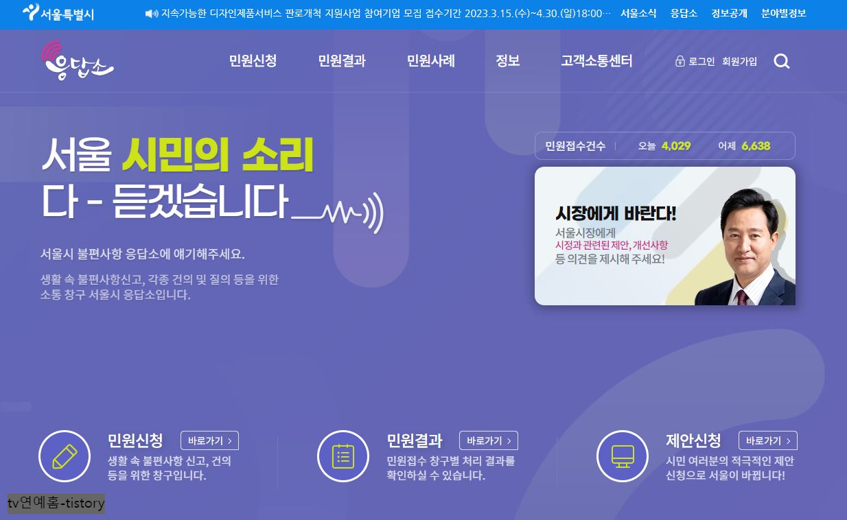 서울시 응답소 홈페이지는 서울시 모든 민원을 통합, 관리하는 온라인 시스템으로 인터넷, 모바일, SNS, 전화로 신청하는 민원을 업무분야와 무관하게 접수하여 신속하게 처리 후 결과를 알려주는 시스템입니다.