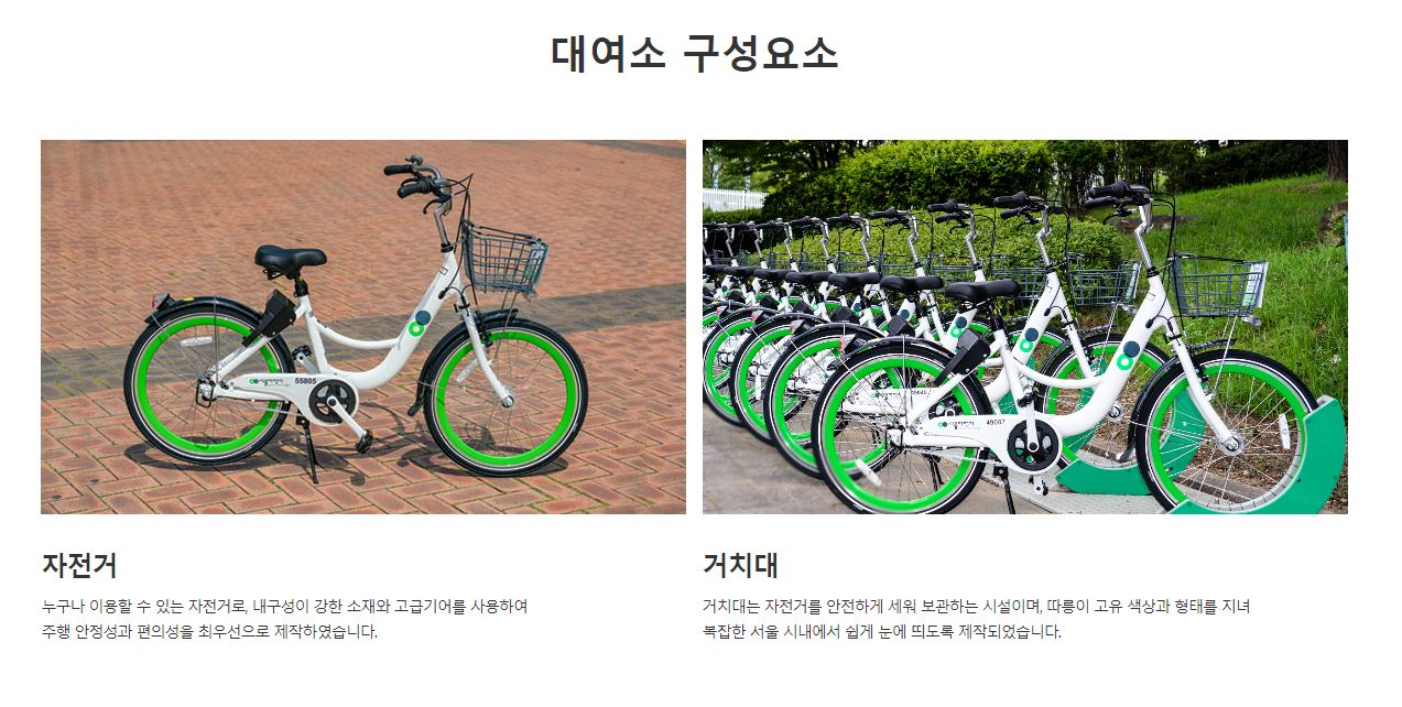 따릉이는 거치대에서 자전거를 대여하는 시스템으로 자전거는 내구성이 강한 소재 및 고급기어를 사용하여 주행시 안전하며 편리하다고 합니다. 거치대는 자전거를 안전하게 보관해주며 눈에 띄도록 제작되었다고 합니다.