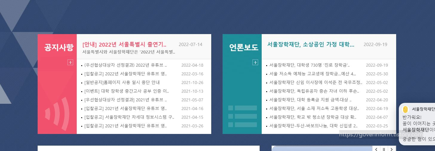서울장학재단은 공지사항과 언론보도 게시판이 있습니다. 공지사항은 서울장학재단의 우선협상대상자 선정결과 입찰공고 일반공지 이벤트 등에 대한 사항이 올라와있습니다.