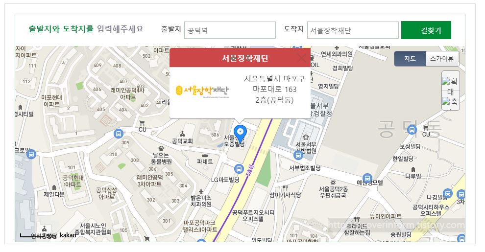 서울장학재단은 (04130)서울특별시 마포구 마포대로 163 2층(공덕동)에 위치하고 있으며 전화번호는 02-725-2258 팩스 070-4133-2258 이메일 hiss@hissf.or.kr 입니다. 교통편은 지하철 5호선 6호선 공덕역 3번 출구에서 마포 경찰서 방면 600미터 5호선 애오개역 1번 출구에서 500미터 버스 1002, 160, 260, 300, 7013A, 7013B, 7611, 6015, 6021(공항) 마포경찰서 정류장에서 하차입니다.