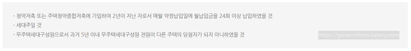 국민주택은 입주자모집공고일 현재 해당 주택건설지역(수도권)에 거주하는 무주택세대구성원에게 1세대 1주택 기준으로 공급하고 있으며 여기에서 말하는 수도권이란 서울특별시, 인천광역시, 경기도를 말합니다. 청약자격은 1순위는 청약저축 또는 주택청약종합저축에 가입하여 1년이 지난 자로서 매월 약정 납입일에 월납입금을 12회 이상 납입한 자이나 투기과열지구에서 공급되는 주택, 청약조정대상지역에서 공급되는 청약조정대상주택의 경우에는 (서울 전 지역 해당) 아래 요건을 모두 충족하여야 합니다. · 청약저축 또는 주택청약종합저축에 가입하여 2년이 지난 자로서 매월 약정납입일에 월납입금을 24회 이상 납입하였을 것 ·세대주일 것 ·무주택세대구성원으로서 과거 5년 이내 무주택세대구성원 전원이 다른 주택 당첨자가 되지 아니하였을 것