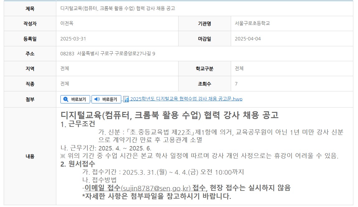 이 홈페이지에는 서울특별시 남부 교육청에서 제공하는 구인구직 정보를 바로 확인할 수 있다. 구인구직 정보가 주기적으로 업데이트돼서 자주 방문하는 것도 좋은 방법이다.