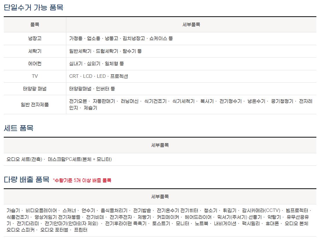 하단에 있는 사항에 한해서는 무상으로 수거해 간다. 수거 요청을 원하는 경우 평일 08:00~18:00에 콜센터 1599-0903이나 인터넷 www.15990903.or.kr(온라인 무상수거 신청)에서 가능하다. 새 제품 구입 시 배달설치 기사에게 수거 요청을 하면 된다.