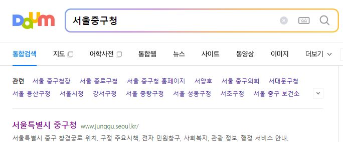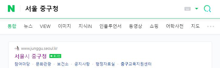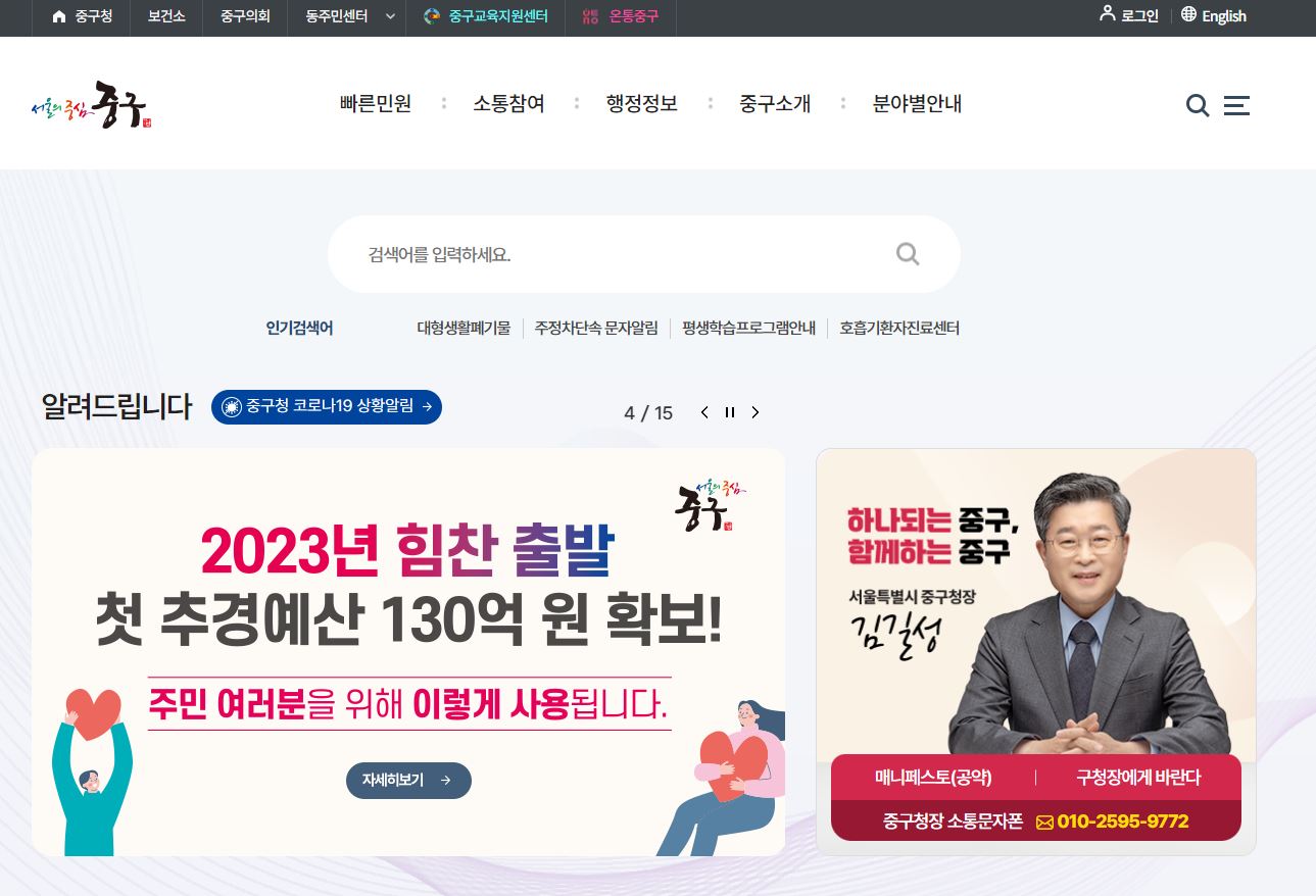 구글이나 평소 이용하는 포털 검색창에 서울 중 구처를 입력하면 서울 중구청 홈페이지가 나온다. 여기에 접속하면 서울 중구청 홈페이지 첫 화면(메인화면)을 볼 수 있다.