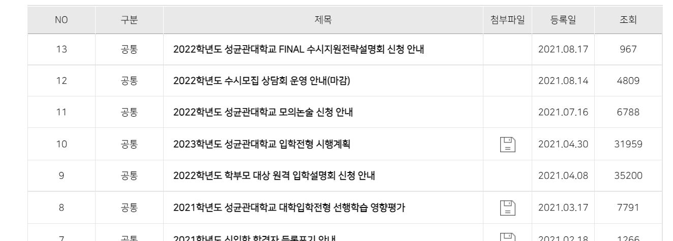 아래는 입시 홈페이지에 올라오는 자료들입니다.
