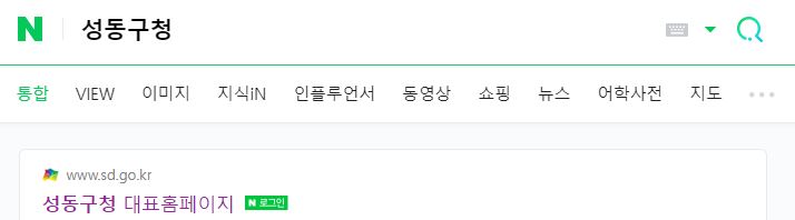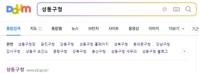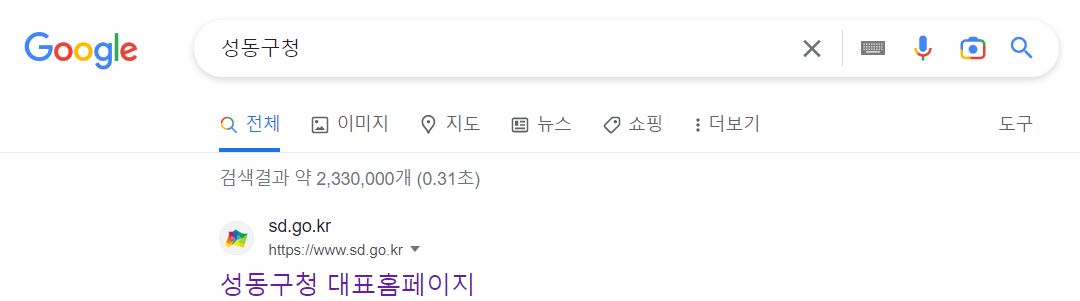 구글, 다음, 네이버 등 평소 이용하는 포털 검색창에 성동구청을 입력하고 검색하면 성동구청 url(https://www.sd.go.kr)이 나오고 여기에 접근하면 성동구청 홈페이지를 볼 수 있다.