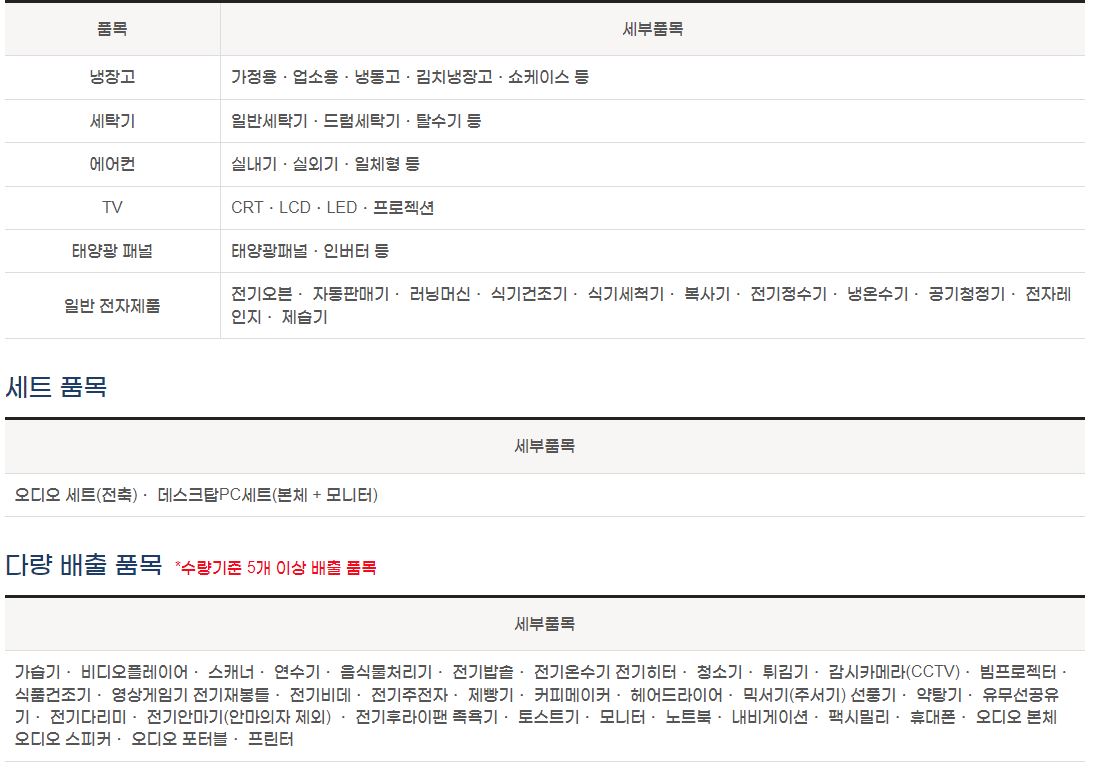 무상수거 가전제품도 있으니 아래 품목에 해당되는 경우에는 1599-0903로 연락하여 무상방문 수거 서비스 예약을 하면 된다. 다량 배출 품목에 해당되는 경우 해당 품목 내 제품이 5개 이상 배출되는 경우에 한해 무상 수거가 가능하니 이 점 참고 하시기 바란다.