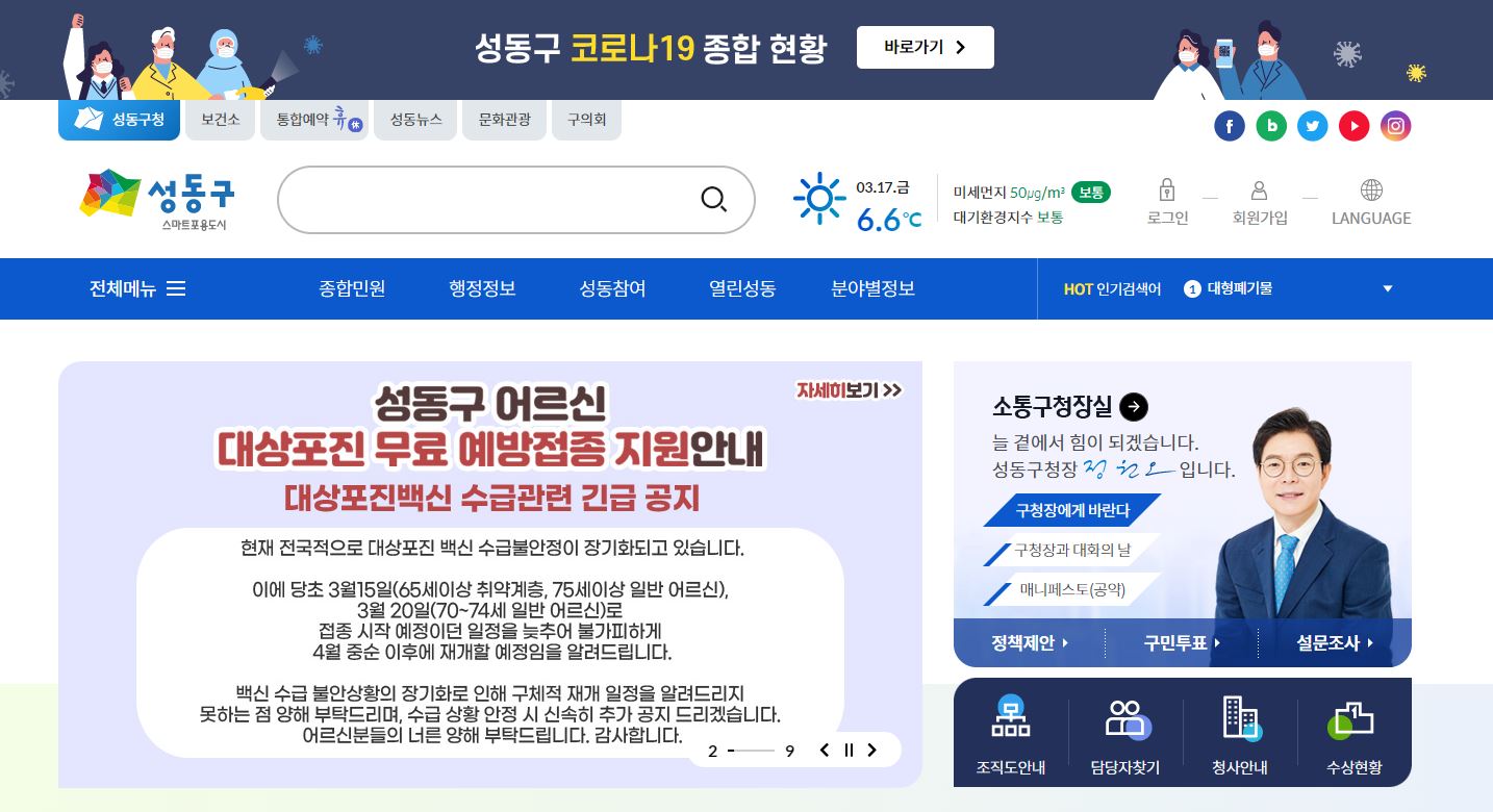 성동구청 홈페이지 첫화면은 다음과 같다.