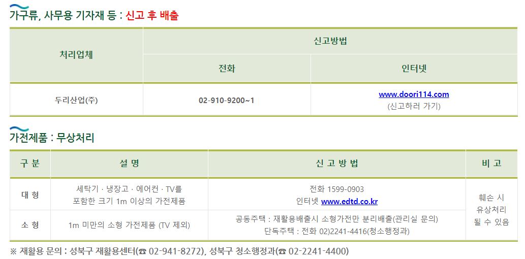 아래와 같이 대형폐기물 종류에 따라 처리방법에 대한 자세한 안내가 있습니다.