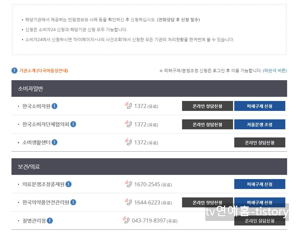 신청가능여부에서 신청가능이 나온 경우 소비자24 홈페이지에서 신청이 가능합니다. 각 기관에서 민원정보 및 사례를 확인하고 신청해야 합니다. 필요한 경우 전화상담을 하고 신청하시기 바랍니다.