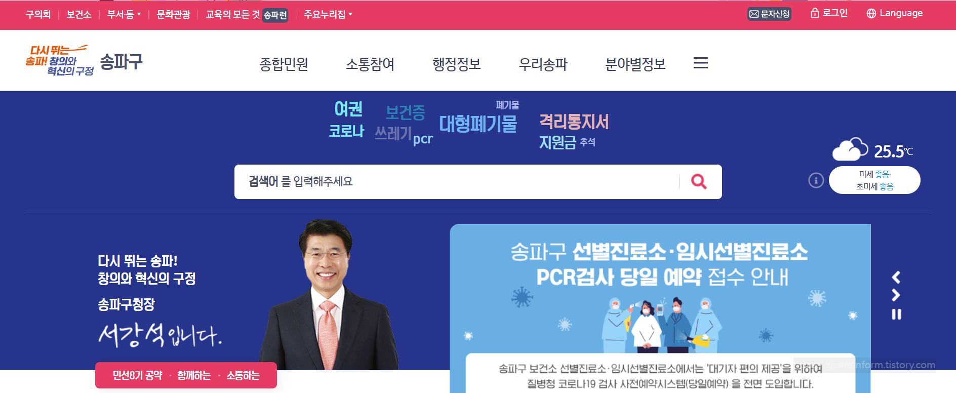 접속방법은, 포털검색창에 "송파구청"입력후 검색하여 홈페이지에 접속하기 또는 아래 url을 이용해도 됩니다. (송파구청 홈페이지 바로가기)