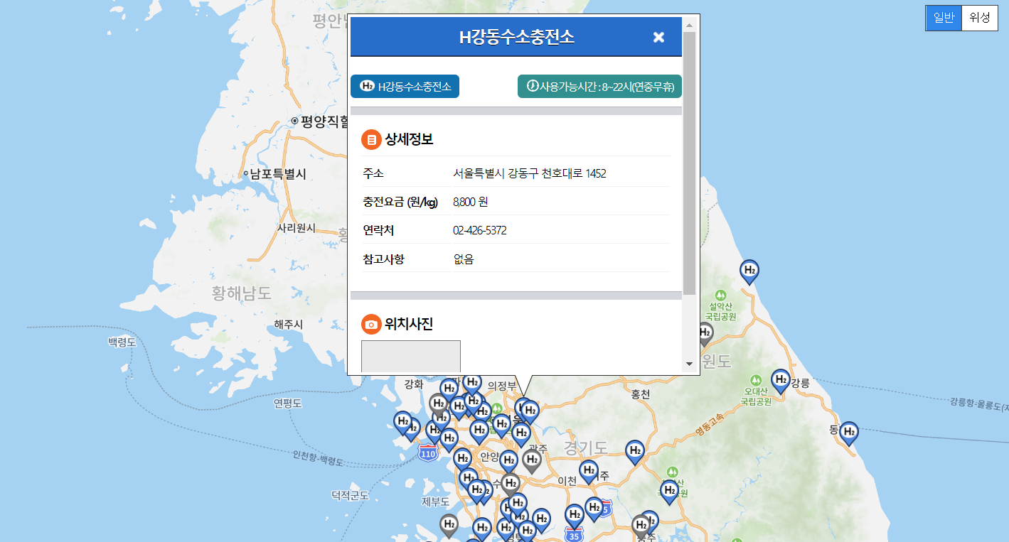 서울시/강동구로 검색해보니 H강동수소충전소가 나온다. 이용가능시간, 주소, 연락처, 충전요금까지 나온다. 위치사진은 업데이트된 것도 있고 준비 중인 것도 있다.