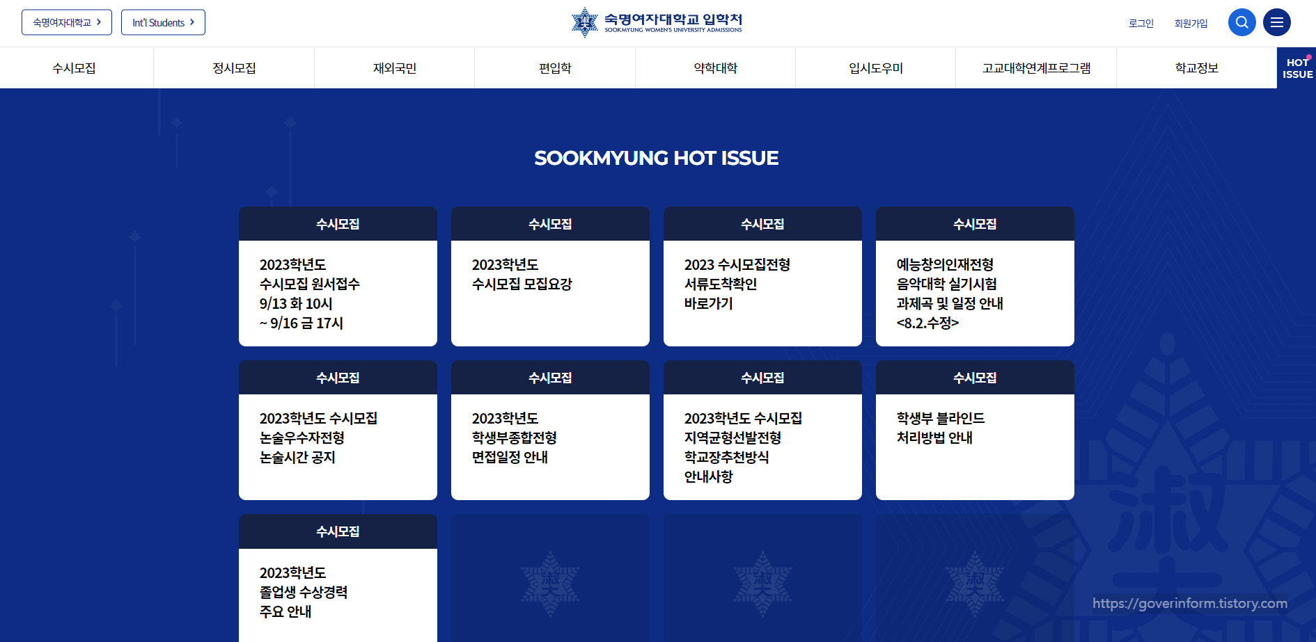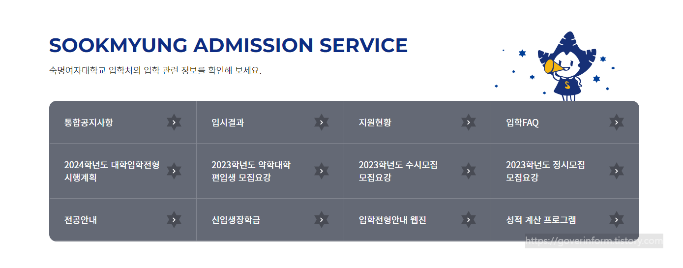 https://admission.sookmyung.ac.kr/admission/html/main/main.asp (- 숙대 입학처 홈페이지 url