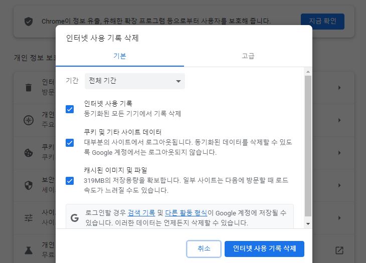 인터넷사용기록, 쿠키 및 기타 사이트 데이터, 캐시 된 이미지 및 파일 박스에 체크를 모두하고 인터넷 사용 기록 삭제를 눌러 전부 삭제합니다. 3가지 박스에 모두 체크되어 있는 걸 확인해야 합니다.