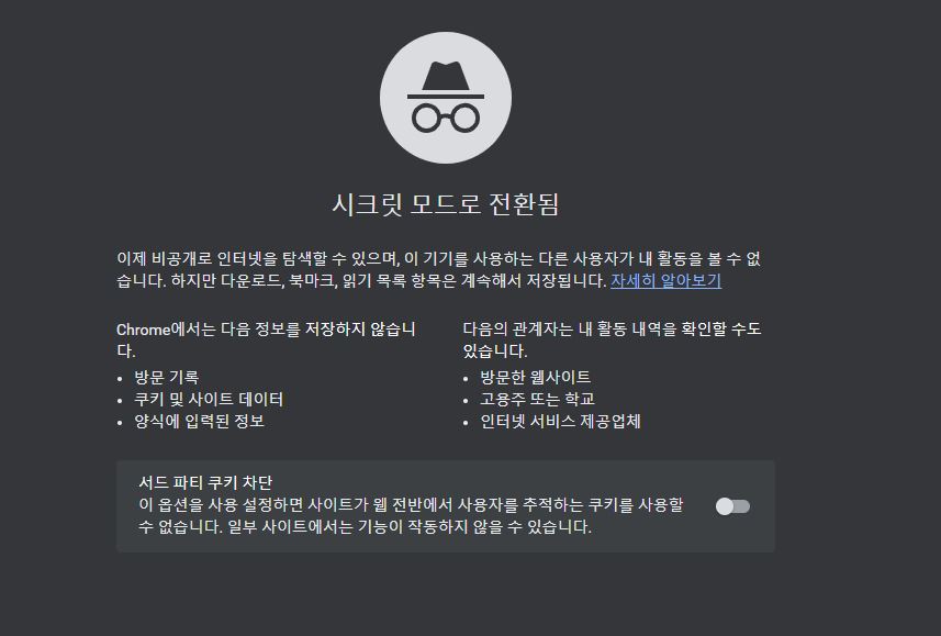 ctrl + shit + N을 동시에 누르면 시크릿 모드가 적용된 창을 볼 수 있습니다. 시크릿 모드에서는 일반창과는 달리 방문 기록이나 쿠키, 사이트 데이터 등이 저장되지 않습니다.