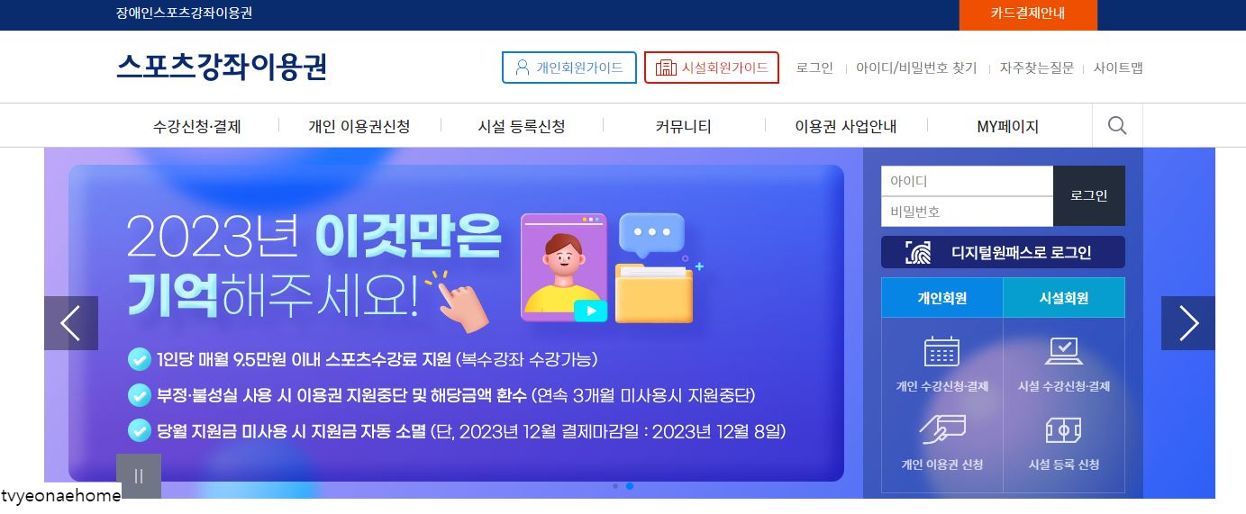 1) 국민체육진흥공단 홈페이지>스포츠강좌이용권 메뉴에 접속합니다.