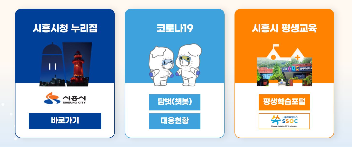 구글 검색창이나 포털 사이트 검색창에 '시흥시청'을 입력하고 검색하면 시흥시청 홈페이지 주소(https://www.siheung.go.kr/main.do)가 나오고 여기에 접근하면 시흥시청 홈페이지 바로가기, 코로나19 챗봇과 대응현황(코로나19 대응현황, 예방접종현황 등), 시흥시 평생교육 평생학습포털 홈페이지에 접근할 수 있는 화면이 나옵니다. 여기에서 가장 처음에 나와있는 시흥시청 누리집 바로가기에 접근하면 시흥시청 홈페이지 이용이 가능합니다.