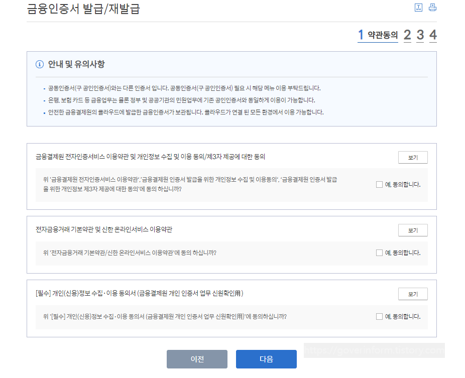 인증서 발급을 위해서는 4단계가 필요합니다. 약관동의, 정보입력, 추가인증/정보확인 및 인증을 마치면 인터넷뱅킹 이용을 위한 준비가 마무리 됩니다.