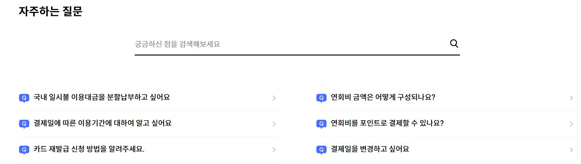 | 2. 결제대금 및 입금관련 문의 | 1) 결제대금 조회 2) 바로결제 서비스(이용금액결제) 3) 가상계좌 및 입금확인 4) 이용내역조회 5)이용대금명세서 및 이메일청구 신청 6) 결제일변경 7) 유가보조금 내역조회 |
