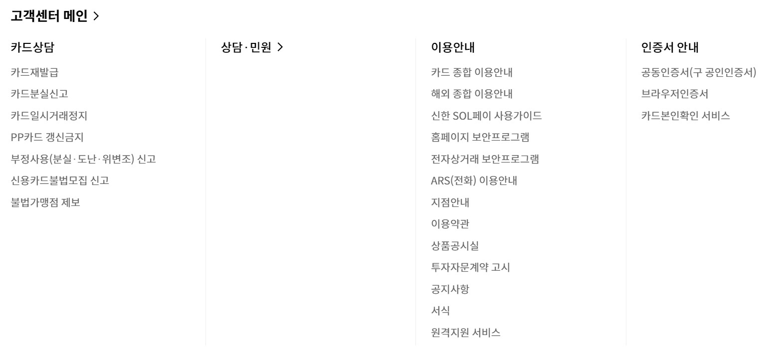 신한은행 홈페이지에는 카드 재발급, 카드분실신고, 카드일시 거래정지, 공동인증서, 상담 및 민원 등 다양한 메뉴가 준비가 되어있습니다.