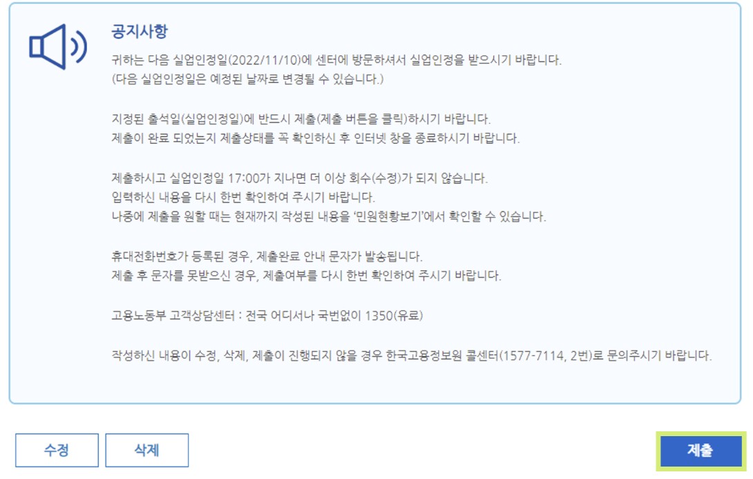 8. 실업급여 신청서 제출은 지정된 출석일(실업인정일) 당일날 00:00 ~ 17:00 사이에만 가능합니다. 제출 완료 버튼 클릭 후 제출이 완료되었는지 상태를 꼭! 체크해야 합니다.