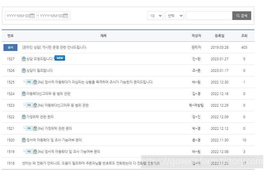 여기에는 기아/미아 시설보호 아동예방 입양/가정위탁 상담/교육 센터소개 서비스가 있다. 온라인 상담서비스도 제공하고 있는데 온라인상담은 게시판에 비회원 글쓰기 또는 회원글쓰기를 하면 답변이 달린다. 아동복지센터> 상담/교육> 온라인 상담으로 접근하면 서비스 이용 가능하다.