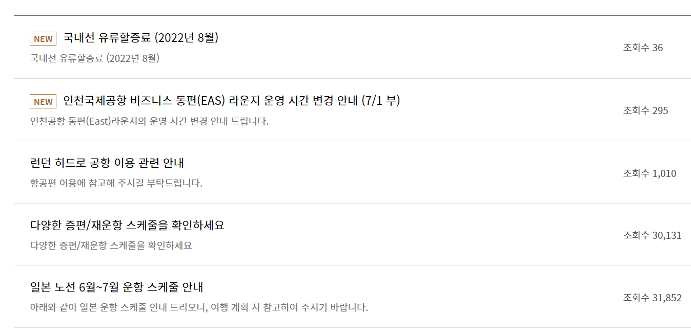 아시아나항공 공지사항에는 유류할증료 변경사항이나 항공편, 공항상황 등 변동사항에 대해 올라옵니다.