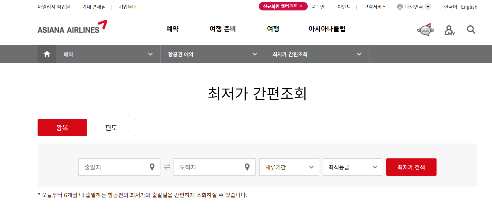 홈페이지에 접속하면 항공권 예약, 여행준비, 아시아나클럽, 고객센터 등 정보가 나와있습니다.