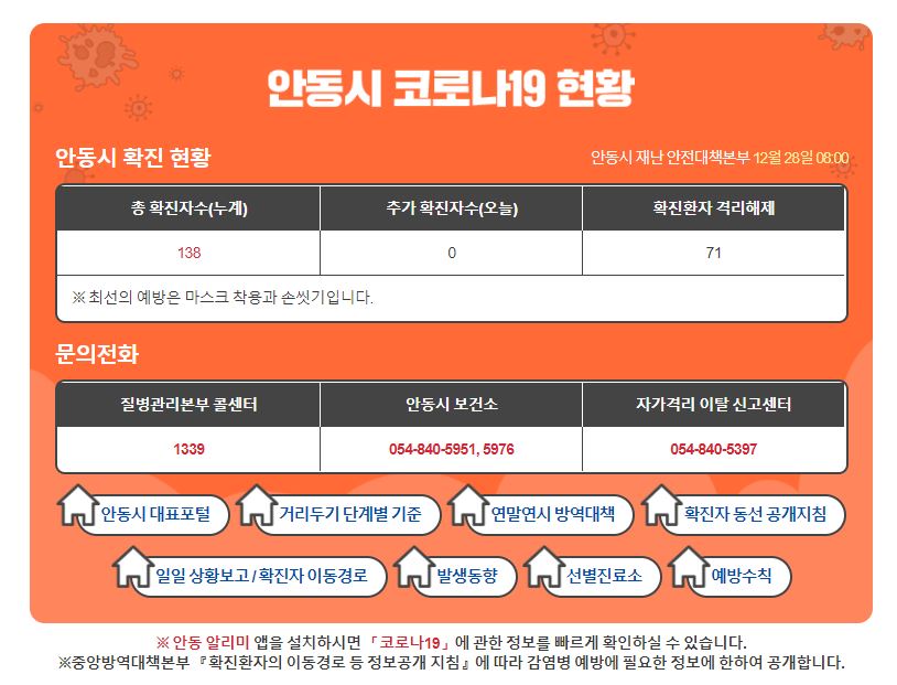 안동시청 홈페이지에서는 코로나19를 포함한 유용한 정보를 볼 수 있습니다.