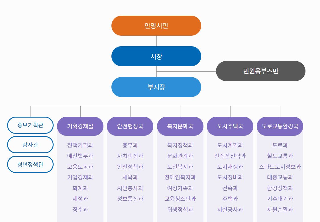 안양시 조직도는 안양시민을 중심으로 다음처럼 구성되어있습니다. 전체보기는 안양시청 홈페이지에서 해야합니다. 각 부서 전화번호도 확인할 수 있습니다.