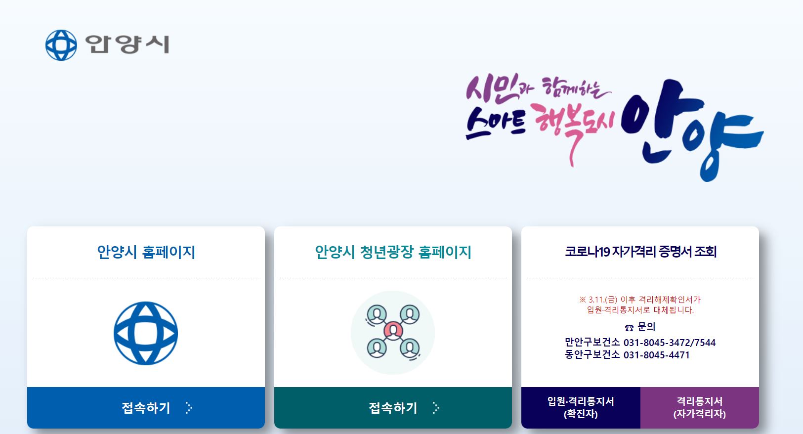 다음은 안양시청 홈페이지 첫화면입니다. 안양시 홈페이지, 안양시 청년광장 홈페이지, 코로나19 자가격리 증명서 조회 이렇게 세가지가 있는데 가장 첫번째에 있는 안양시 홈페이지를 터치하면 됩니다.
