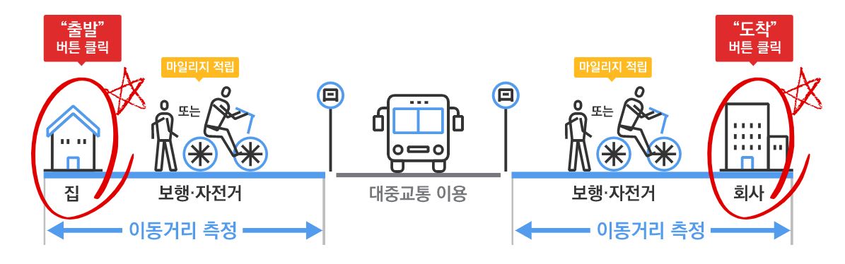 마일리지 적용 방식은 다음과 같으며 출발지에서 대중교통 승차지점까지 걷거나 자전거를 통해 이동한 거리를 측정하고 대중교통 하차지점에서 도착지까지 걷거나 자전거를 통해 이동한 거리를 측정합니다. 대중교통 이용정보 및 알뜰교통카드 앱 출발, 도착정보 일치여부를 확인하며 확인이 된 경우 이동거리에 비례하여 앱 출발, 도착정보 일치여부를 확인합니다. 환승 과정 이동거리는 미포함합니다.