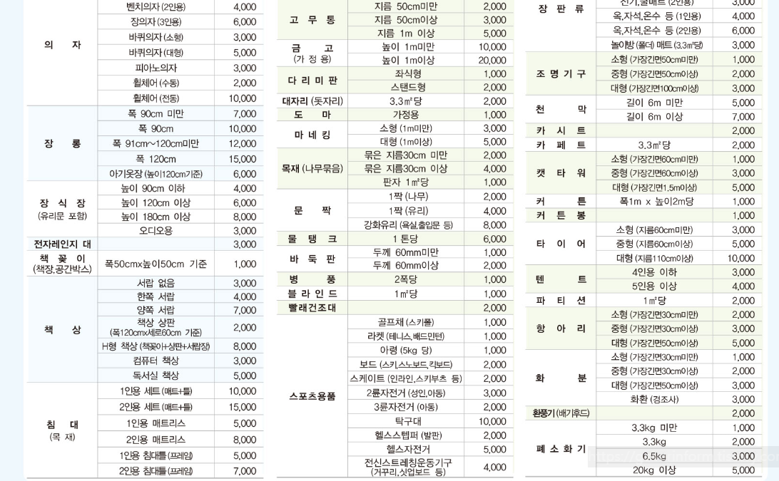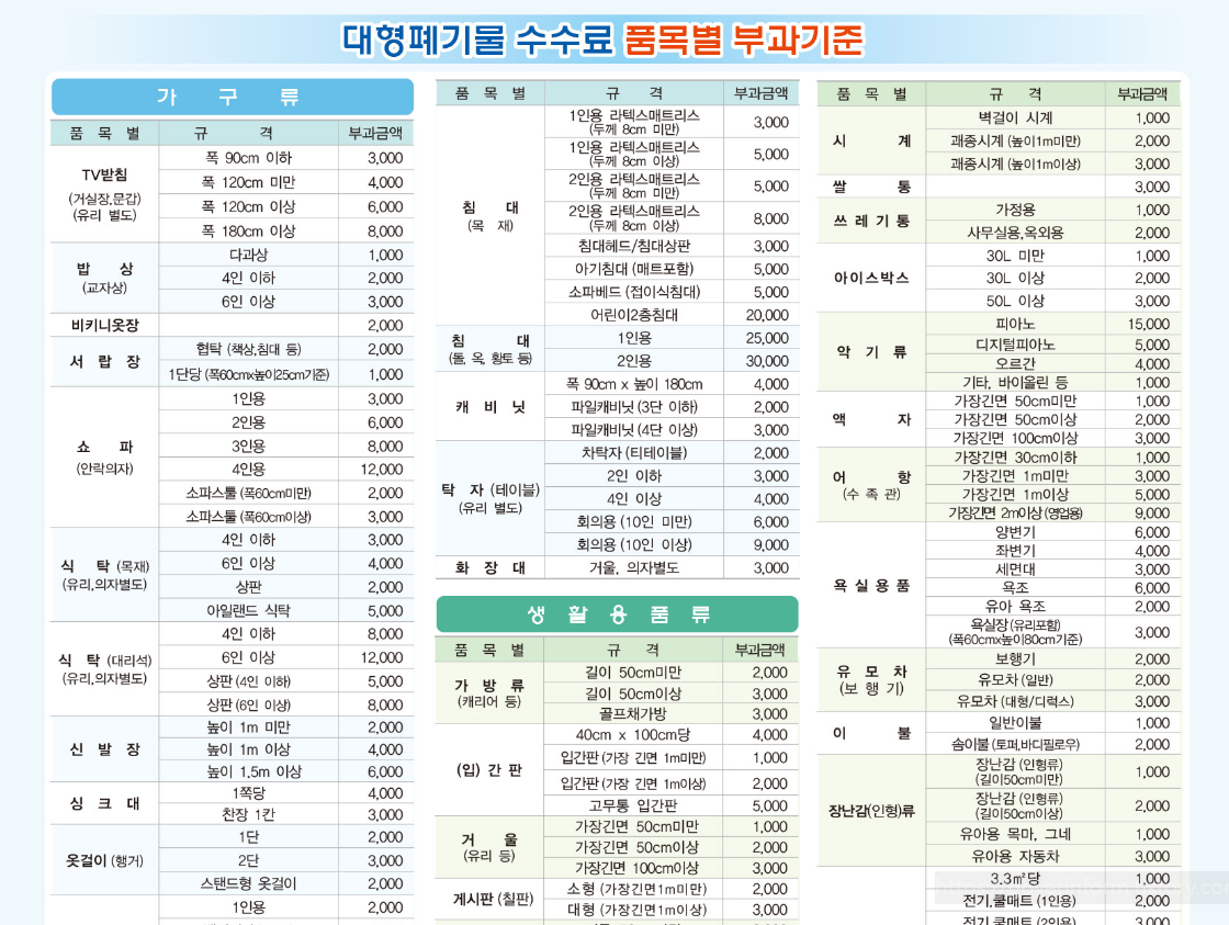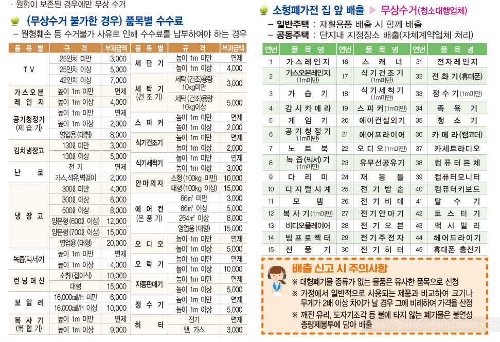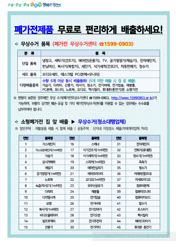 대형폐기물 중 무상 수거품목이 있습니다. 단일품목(냉장고, 세탁기, 에어컨), 세트품목(오디오세트, 데스크탑), 다량배출품목(가습기, 다리미, 청소기 등 5개 이상)등이 있으니 아래 내용을 확인해보세요.
