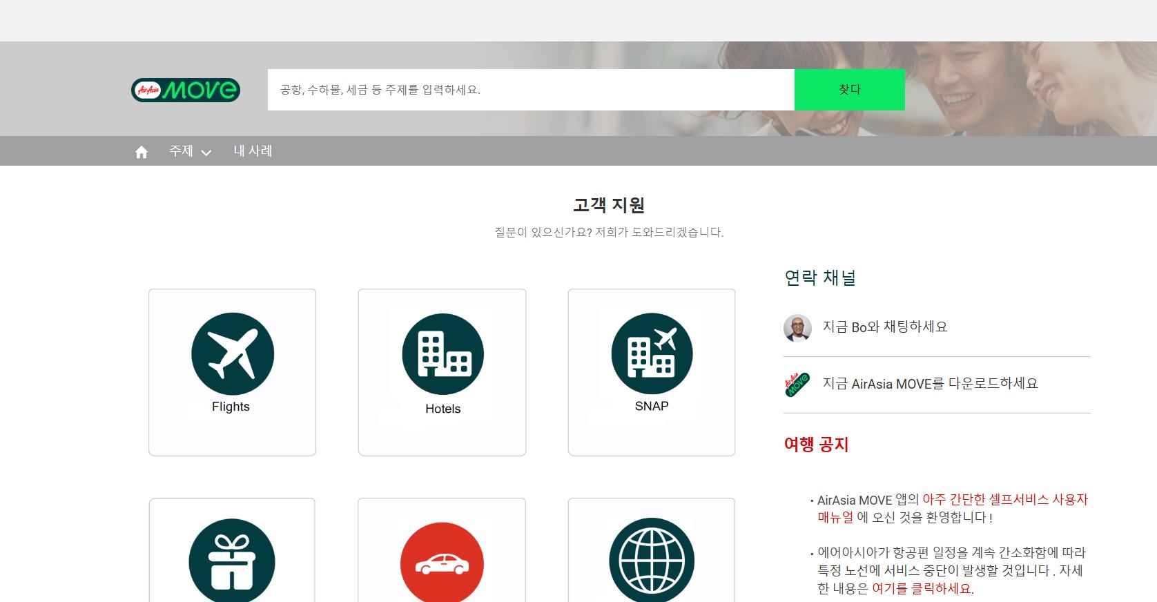 전화가 연결되지 않는다면, 에어아시아 사이트를 통해 고객 서비스를 이용해 보세요. 온라인 실시간 채팅 서비스나 자주 묻는 질문을 이용할 수 있습니다.